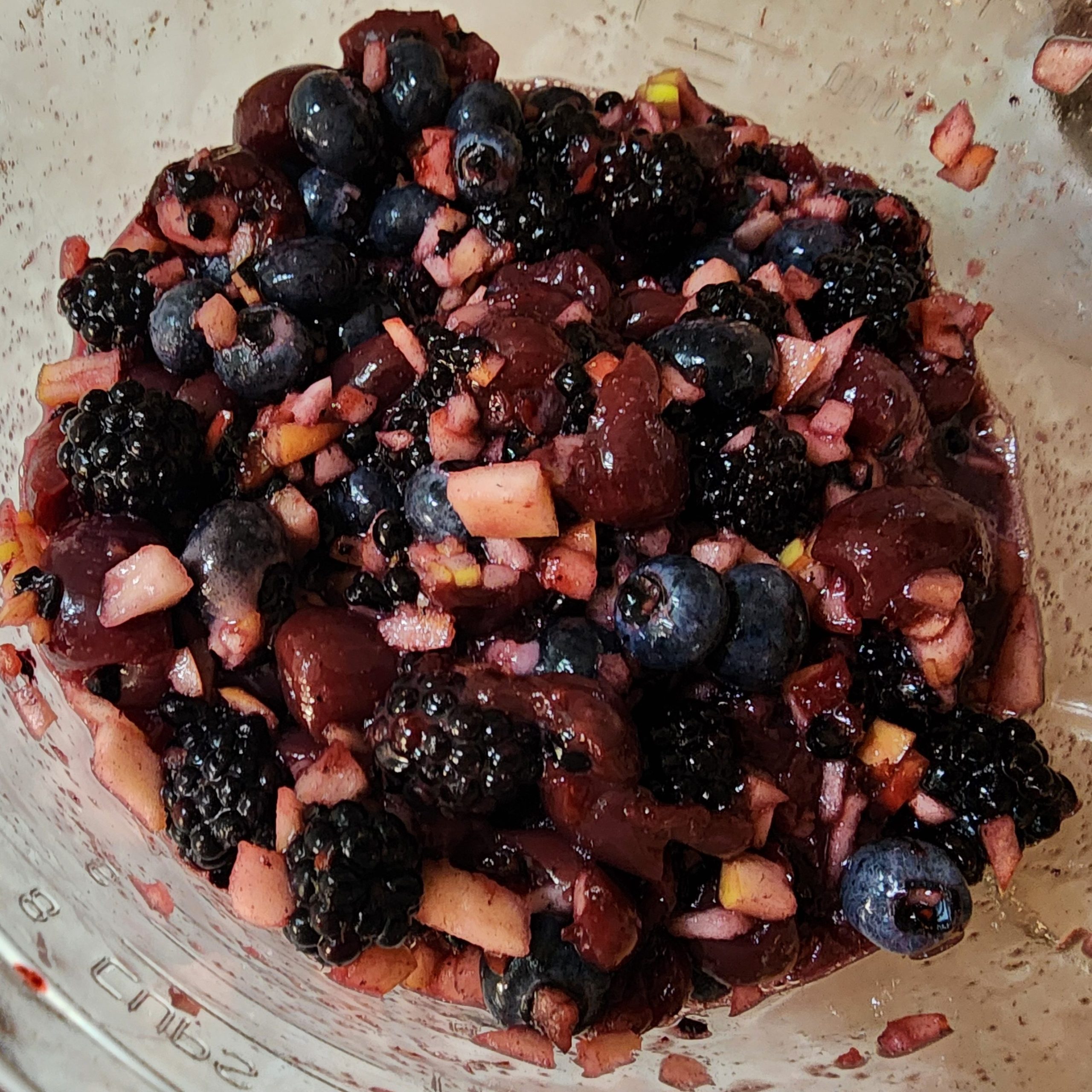 Lisa made a spinach salad with blueberries, feta, toasted walnuts, and a honey balsamic vinaigrette. She said she usually makes a similar salad in the fall or winter, but this is the first time trying it with blueberries. She also made a gorgeous Bumbleberry Pie with blueberries, wild blackberries, cherries, and an apple. I love the heart in the middle!